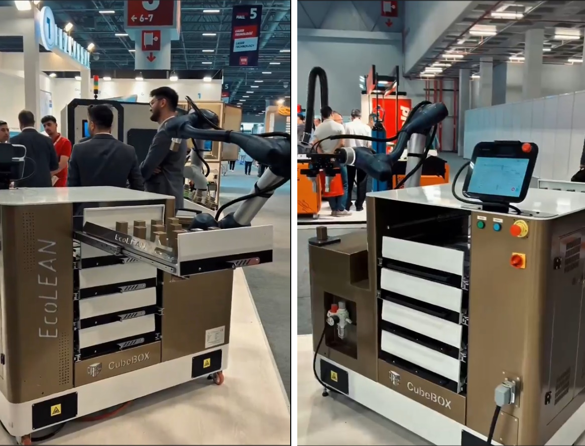 CubeBOX EcoLEAN est une plateforme robotique à tiroirs. Les pièces sont stockées dans les tiroirs et sont manipulées par le robot. Mobile, la plateforme se déplace facilement.